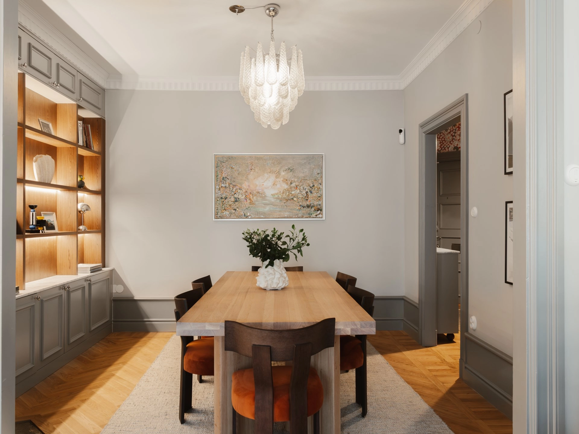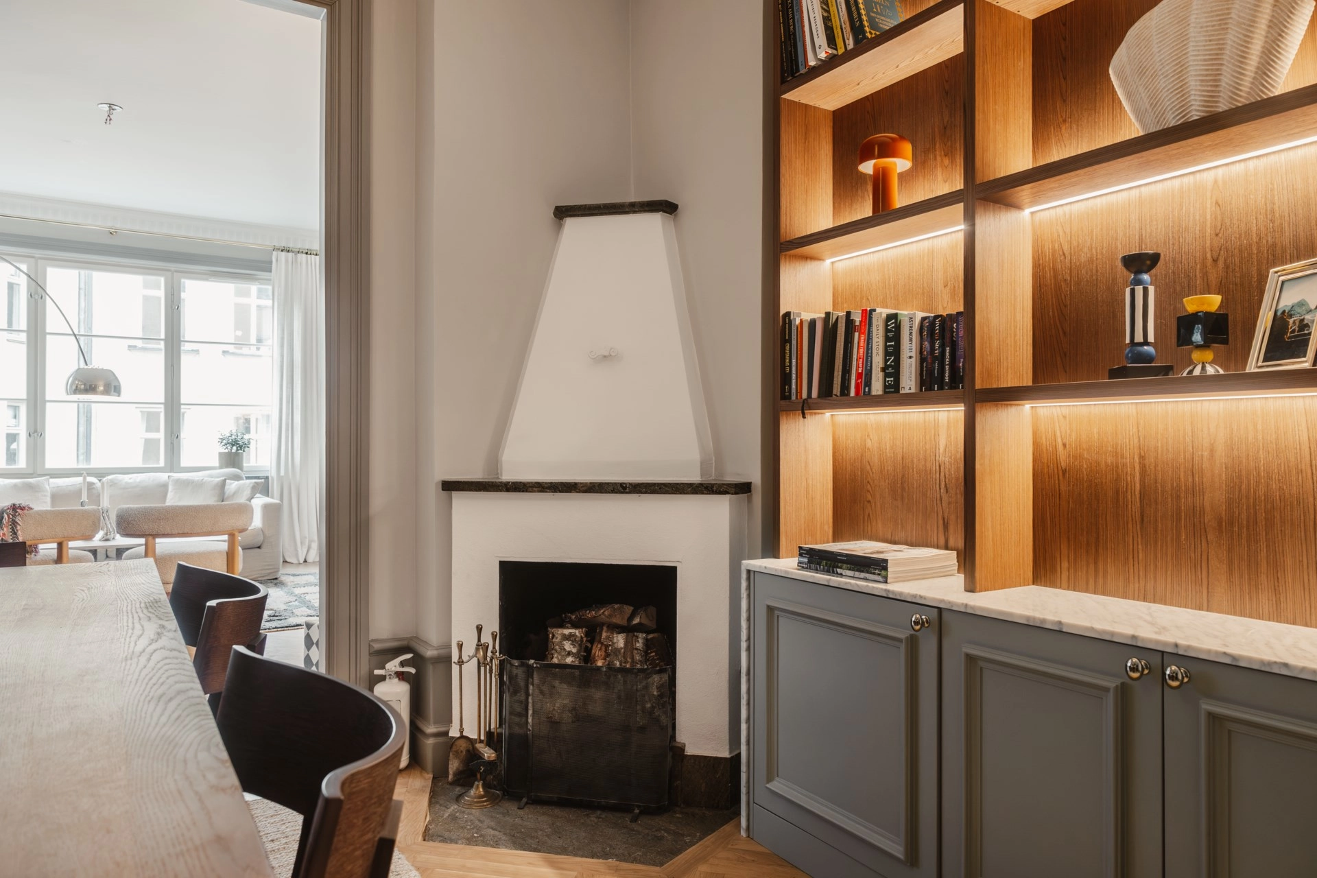 På en av Östermalms mest attraktiva adresseri högt läge, med vacker vy mot Strandvägen och Nybrovikens grönska och vatten, finns denna ljusa och charmiga lägenhet med våningskänsla och öppen spis. Tack vare lutningen på Styrmansgatan, upplevs den betydligt högre upp än en klassisk en trappa. Omfattande renoveringar har genomförts med perfekt balans mellan påkostade materialval och bevarad sekelskiftescharm. Genomgående för bostaden är vacker fiskbensparkett, höga golvsocklar och vackra stuckaturer. Bostaden har vackert burspråk med generöst ljusinsläpp och vy mot Strandvägen samt plats för större soffgrupp. I anslutning till vardagsrummet finns bostadens matplats som präglas av en exklusiv platsbyggd bokhylla i trä med inbyggd belysing som harmoniserar fint med sekelskiftsdetaljerna. Köket är exklusivt platsbyggt med luckor i sober mörkgrön ton, köksö, bänkskiva i marmor och gott om arbetsytor. Rofyllt sovrum med platsbyggda garderober. Elegant badrum med platsbyggd kommod från vesani, golvvärme och uppvärmd handdukstork. Genomtänkt hall, tapetserad med svensk tenn tapet och höga golvsocklar. Gott om förvaring i platsbyggda garderober. En charmig sekelskiftesvåning där hög takhöjd, burspråk och öppen spis möter moderna och exklusiva tillval.