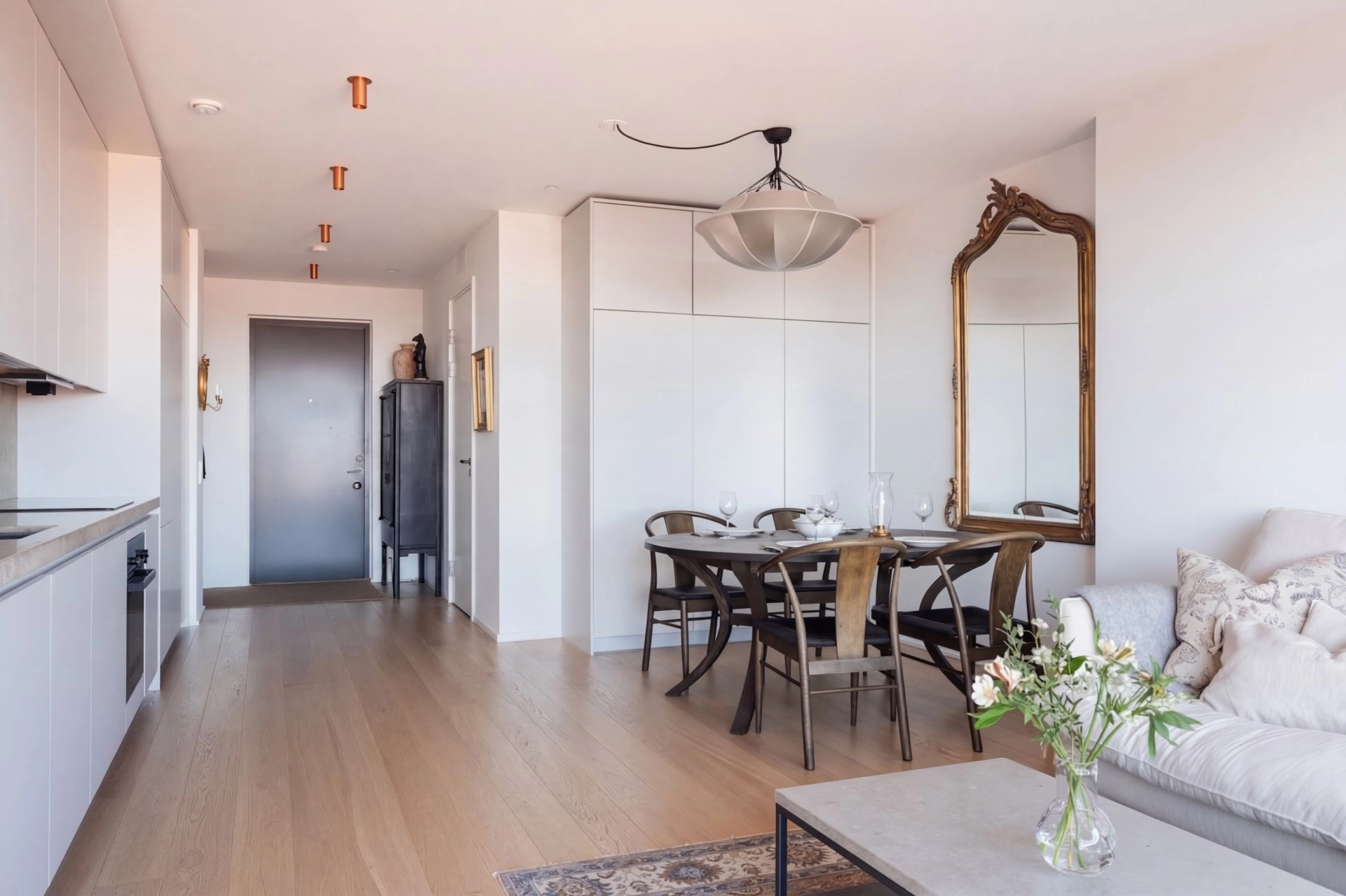 Bostaden är varsamt renoverad och präglas av exklusiva materialval, målade väggar, rena linjer och internationell elegans. Generösa golv-till-tak-fönster ramar in utsikten och förstärker rymd, ljus och sofistikering. Vardagsrum och kök i öppen planlösning skapar en social och inbjudande miljö, med kök i sobert utförande och integrerade vitvaror. Från sovrummet nås balkongen som förlänger rummet och bjuder på en vidsträckt panoramautsikt – lika hänförande dag som kväll, med sol från morgon till eftermiddag.